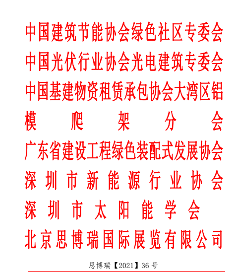 组织机构 中国建筑节能协会绿色社区专业委员会 中国光伏行业协会光电建筑专业委员会 中国基建物资租赁承包协会大湾区铝模爬架分会 广东省建设工程绿色与装配式发展协会 深圳市太阳能学会 深圳市新能源行业协会 北京思博瑞国际展览有限公司 广东省建筑节能协会 海南省建筑节能协会 海南省建设信息协会 深圳市水泥及制品协会 中国建筑节能协会工程改造与加固分会 中国建筑节能协会绿色建筑投资促进分会 广西墙体材料协会 深圳市海绵城市协会 中建政研集团 吉林建筑大学