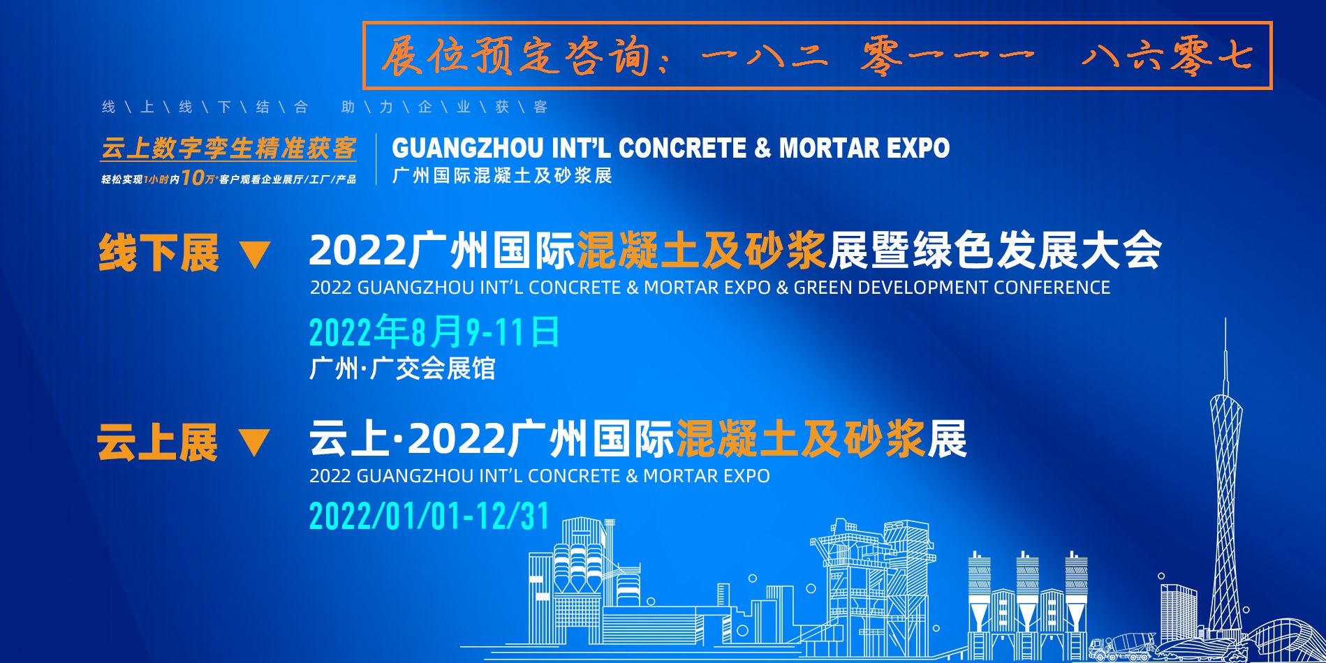 2022年08月09-11日,由广东砂石协会、广州市混凝土行业协会、广东鸿威国际会展集团有限公司共同主办的“2022广州国际混凝土及砂浆展”在广州广交会展馆举办,以“智联天下·绿绘未来”为主题,组委会将邀请全球各地区行业协会、专家顾问、企业精英代表共同出席探讨行业发展,构建行业全产业链发展矩阵,搭建行业全产业链交流合作平台,助力中国混凝土及砂浆产业健康有序发展。