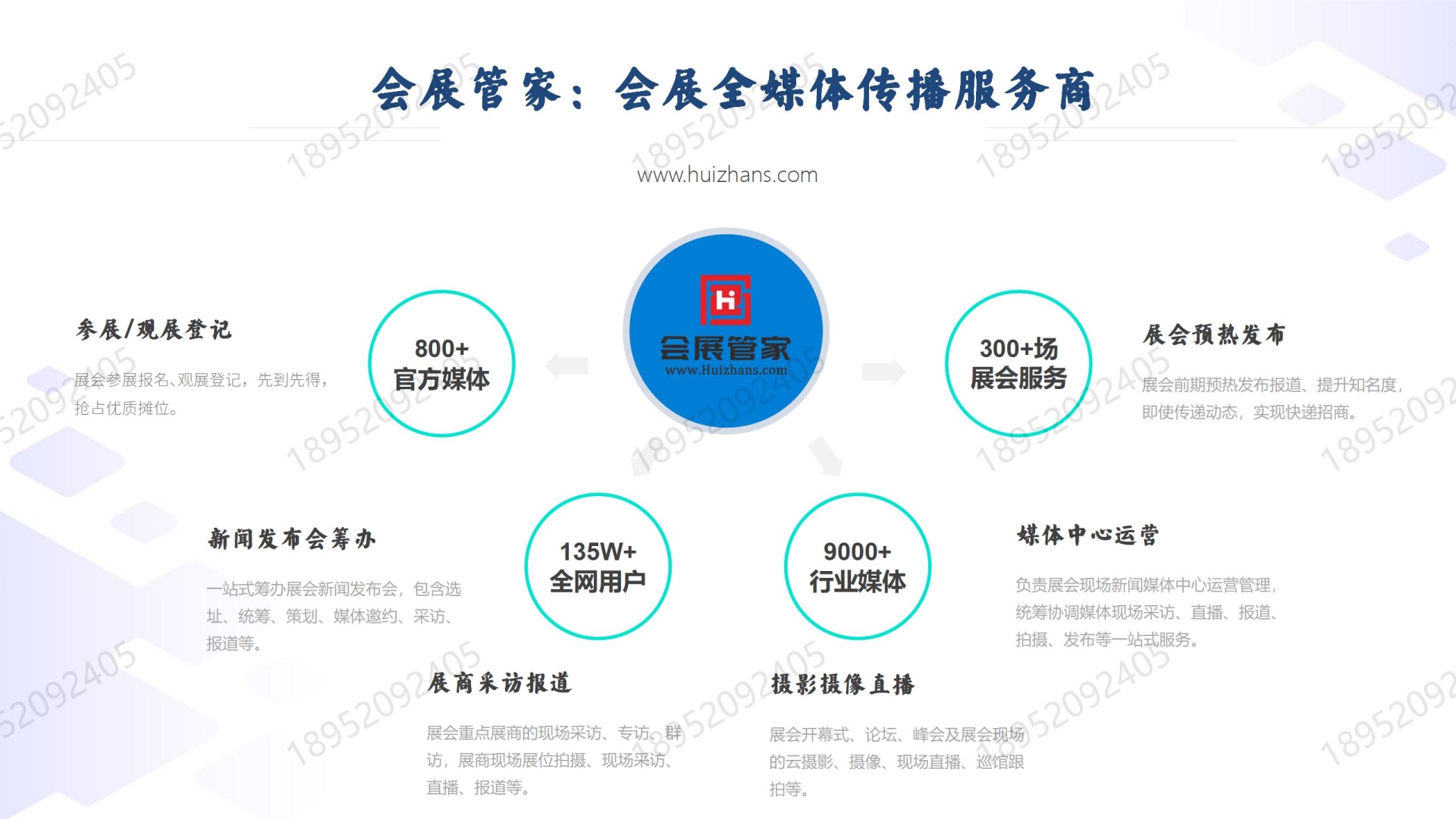 会展管家服务内容:提供全方位、专业的会展媒体解决方案,覆盖活动策划、媒体邀请、现场报道、后期推广等环节,拥有丰富的媒体传播宣发资源,提供一站式服务。