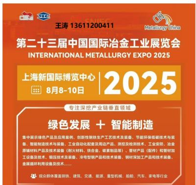 时间:2025年8月8-10日 地点:上海新国际博览中心 主办单位:中国钢铁工业协会 中国国际贸易促进委员会冶金行业分会 承办单位:冶金工业国际交流合作中心
